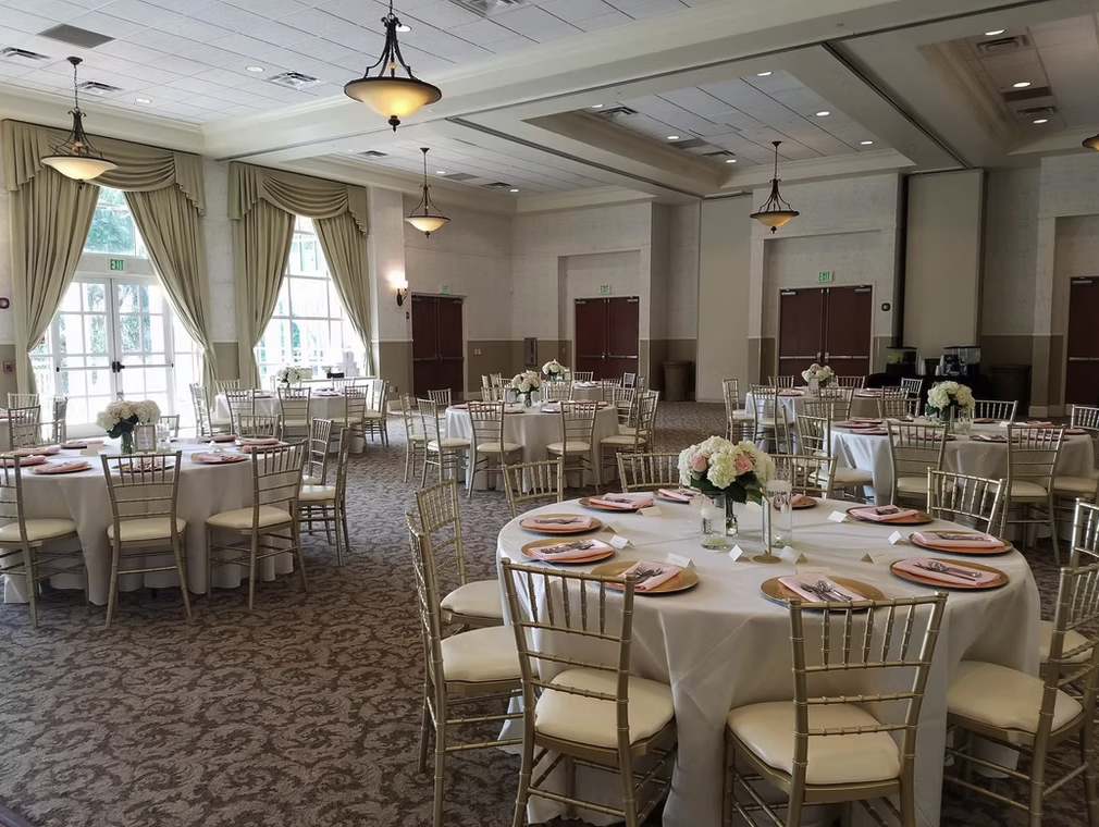 Elegant wedding reception setup with round and rectangular tables, floral centerpieces, place settings, and a DJ booth, featuring large windows with a view of a golf course and lake.