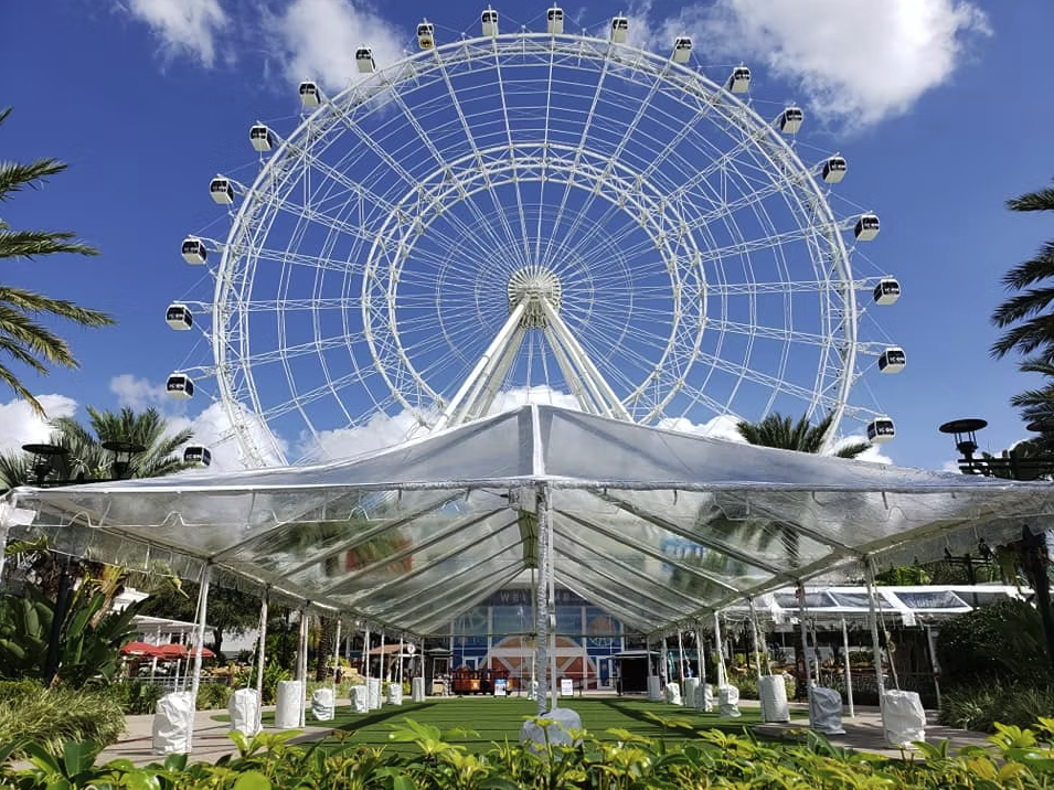 Large Ferris wheel behind a white tent structure, surrounded by greenery and palm trees.