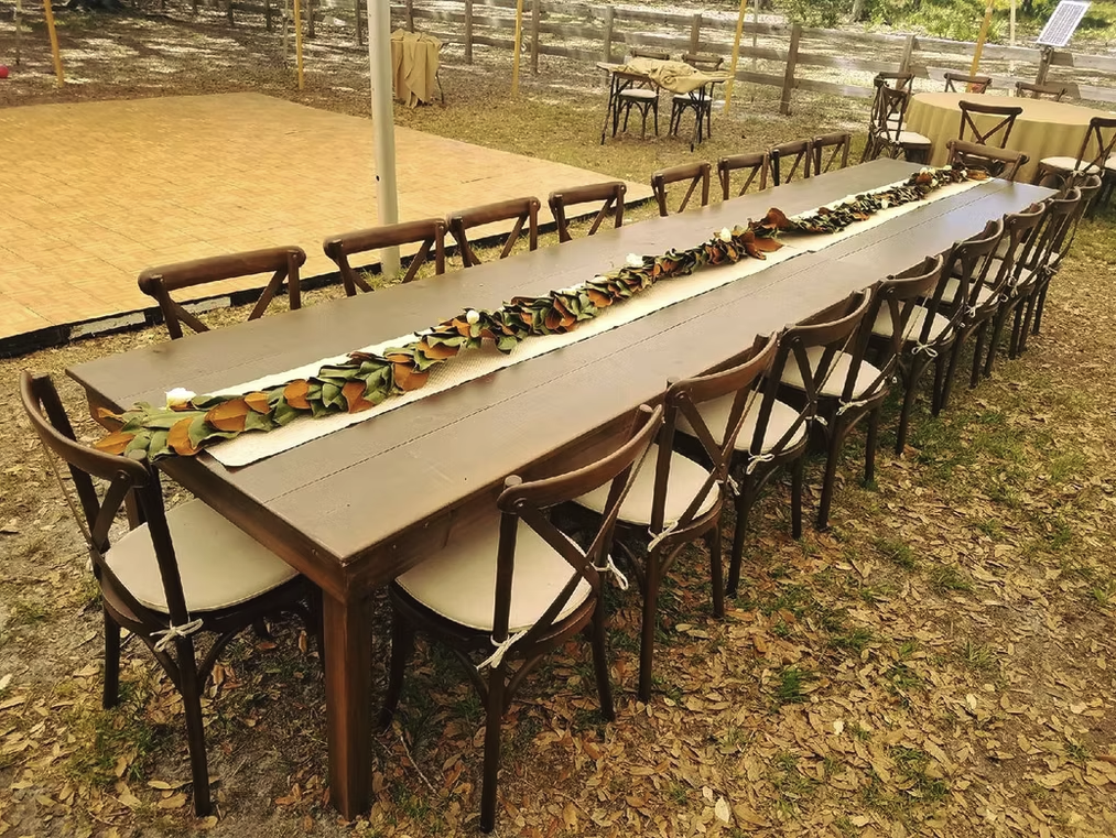 Long wooden dining table with chairs outdoors, decorated with a leafy garland, set on a grassy area with fallen leaves.